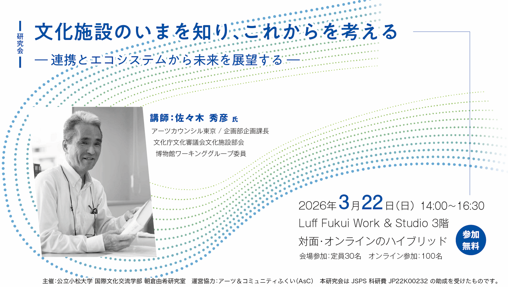 本研究会では、文化政策および全国の最新動向について講師から話題提供をいただくとともに、福井における施設リニューアル議論の進展をひとつの契機として、具体的な地域や施設を想定しながら、文化施設の役割と連携の可能性について参加者とともに考えます。文化施設の「いま」を知り、これからを展望する機会とします。